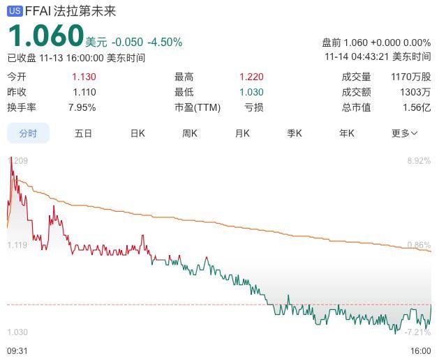 截至美东时间11月13日16点整美股收盘,FF股价报收1.060美元,跌幅4.50%,总市值为1.56亿美元。