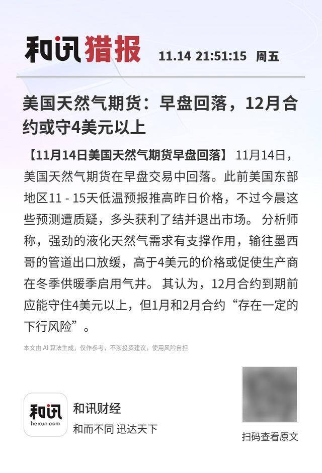 【11月14日美国天然气期货早盘回落】11月14日,美国天然气期货在早盘交易中回落。此前美国东部地区11 - 15天低温预报推高昨日价格,不过今晨这些预测遭质疑,多头获利了结并退出市场。 分析师称,强劲的液化天然气需求有支撑作用,输往墨西哥的管道出口放缓,高于4美元的价格或促使生产商在冬季供暖季启用气井。 其认为,12月合约到期前应能守住4美元以上,但1月和2月合约“存在一定的下行风险”。