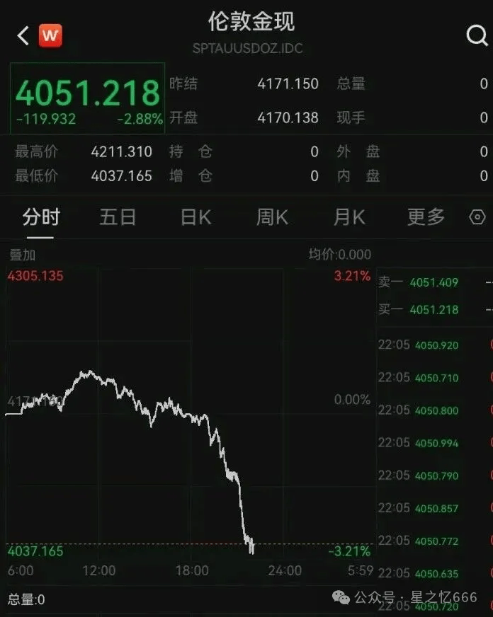 14日晚,现货黄金价格一度大跌3.21%,报4051.22美元/盎司;期货黄金跌幅为3.53%,报4046.4美元/盎司。