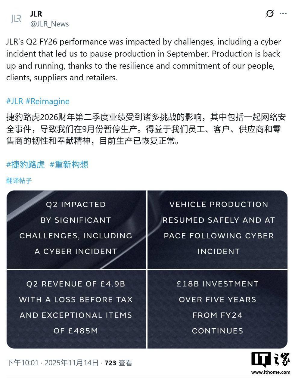 IT之家 11 月 16 日消息,科技媒体 bleepingcomputer 昨日(11 月 15 日)发布博文,报道称捷豹路虎(JLR)公布的最新财报显示,该公司在 2025 年第 3 季度因遭遇网络攻击,直接损失高达 1.96 亿英镑(IT之家注:现汇率约合 18.32 亿元人民币)。
