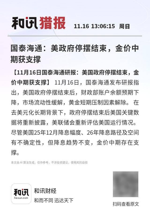 【11月16日国泰海通研报:美国政府停摆结束,金价中期获支撑】11月16日,国泰海通发布研报指出,美国政府停摆结束后,财政部账户余额预期下降,市场流动性缓解,黄金短期压制因素解除。在去美元化长期背景下,政府停摆结束后美国关键数据将重新披露,美联储会重新评估美国运行情况。尽管美国25年12月降息幅度、26年降息路径及空间有不确定性,但降息趋势不变,金价中期存在支撑。