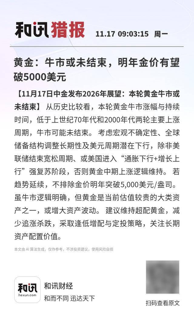【11月17日中金发布2026年展望:本轮黄金牛市或未结束】从历史比较看,本轮黄金牛市涨幅与持续时间,低于上世纪70年代和2000年代两轮主要上涨周期,牛市可能未结束。考虑宏观不确定性、全球储备结构调整长期性及美元周期潜在下行,除非美联储结束宽松周期、或美国进入“通胀下行+增长上行”强复苏阶段,否则黄金中期上涨逻辑维持。若趋势延续,不排除金价明年突破5,000美元/盎司。虽牛市逻辑明确,但黄金是当前估值较贵的大类资产之一,或增大资产波动。建议维持超配黄金,减少追涨杀跌,采取逢低增配与定投策略,关注长期资产配置价值。