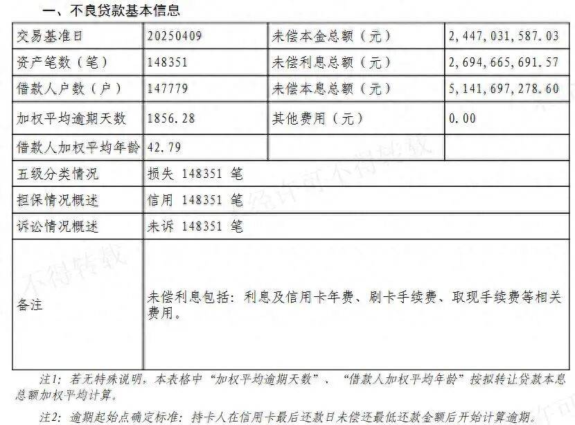 此次转让的不良贷款为2025年第6期个人信用卡透支资产包。其中,未偿还本金达24.47亿元,未偿利息及相关费用为26.95亿元,二者合计规模达51.42亿元。