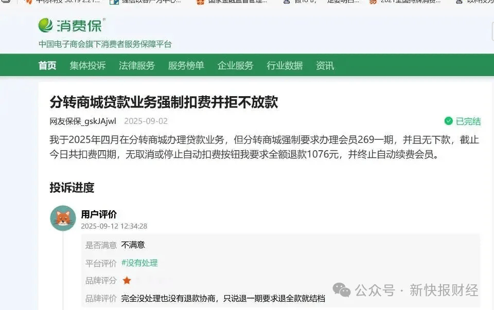 还有借款人称,于2025年4月在分转商城办理贷款业务,但分转商城强制要求办理会员(269元一期),但办理会员后并无下款。截至投诉发布日,共扣费四期,无取消或停止自动扣费按钮。