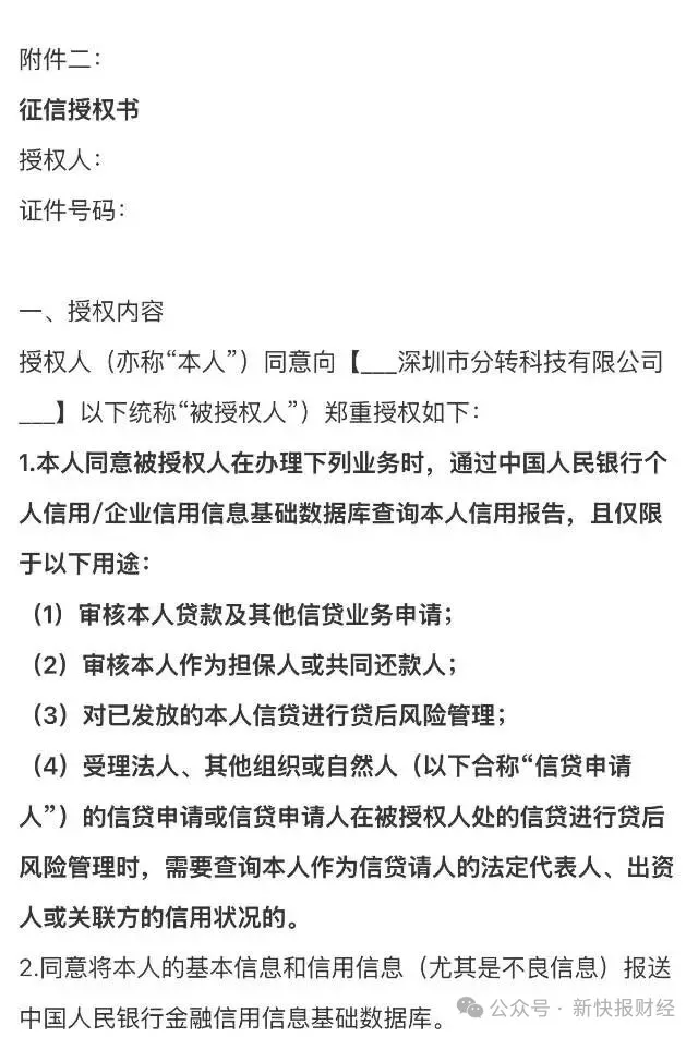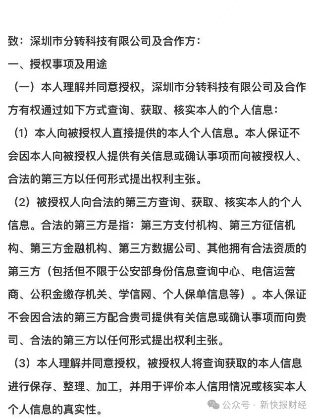 另外,根据分转商城“个人信息查询及使用综合授权书”,深圳市分转科技有限公司及合作方作为被授权人,用户须同意并授权被授权人通过第三方支付机构、第三方征信机构、第三方金融机构、第三方数据公司等第三方平台查询、获取用户个人信息。同时,授权被授权人可在本人借款业务申请阶段及业务存续期间,向中国人民银行金融信用信息基础数据库、征信机构、中国互联网金融协会查询本人的信用信息。
