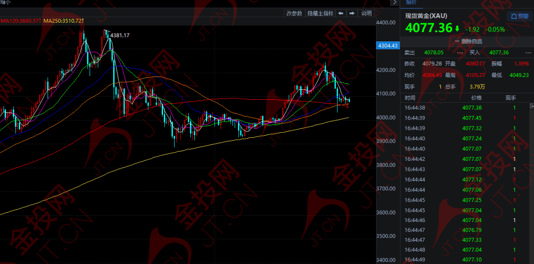上周五,现货黄金一度触及 4211.06 美元高位,随后大幅回落,一度下跌至 4032.10 美元低点。在经过上周四和上周五大跌之后,上周金价涨幅缩减至2.1%。今日欧市盘中,黄金延续跌势,目前在4077美元附近徘徊。