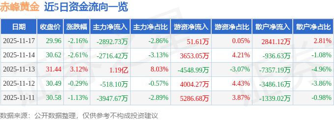 股票行情快报:赤峰黄金(600988)11月17日主力资金净卖出2892.73万元