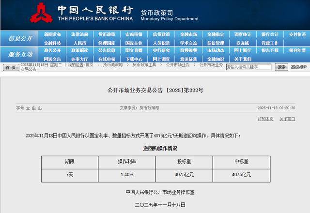 11月18日,据中国人民银行官网消息,2025年11月18日中国人民银行以固定利率、数量招标方式开展了4075亿元7天期逆回购操作,中标量4075亿元,操作利率为1.40%,与此前持平。同花顺iFinD数据显示,11月18日有4038亿元7天期逆回购到期。