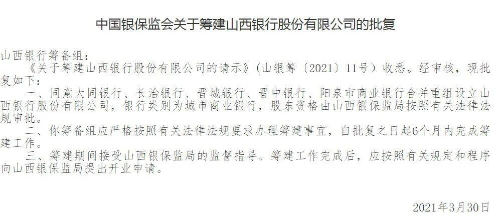 2021年,除了晋商银行之外。其余五家城商行合并重组成为山西银行。