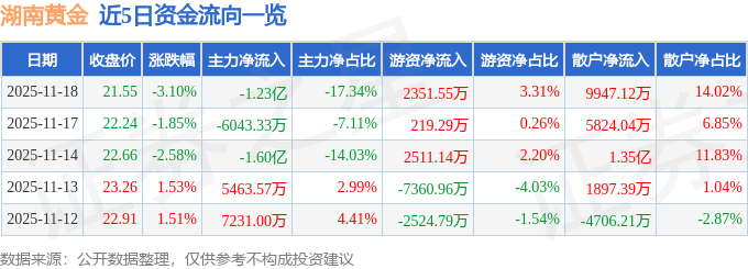 证券之星消息,截至2025年11月18日收盘,湖南黄金(002155)报收于21.55元,下跌3.1%,换手率2.09%,成交量32.64万手,成交额7.09亿元。