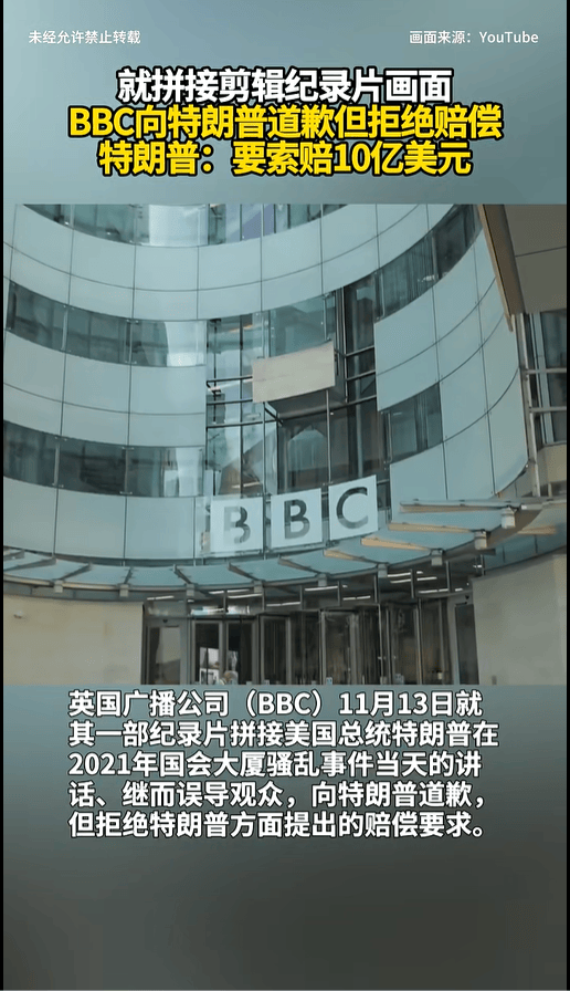 英国广播公司(BBC)11月13日就其《全景》栏目一部纪录片拼接美国总统特朗普在2021年国会大厦骚乱事件当天的讲话、继而误导观众,向特朗普道歉,但拒绝特朗普方面提出的赔偿要求。