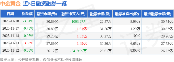 中金黄金融资融券信息显示,融资方面,当日融资买入1.31亿元,融资偿还1.42亿元,融资净偿还1093.27万元。融券方面,融券卖出1.46万股,融券偿还10.45万股,融券余量22.57万股,融券余额471.51万元。融资融券余额30.74亿元。