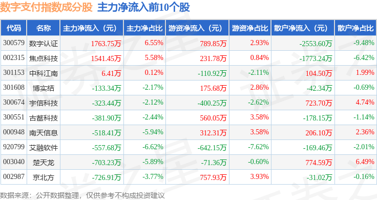 资金流向方面,数字支付(980113)指数成份股当日主力资金净流出合计24.52亿元,游资资金净流入合计7.24亿元,散户资金净流入合计17.14亿元。成份股资金流向详情见下表: