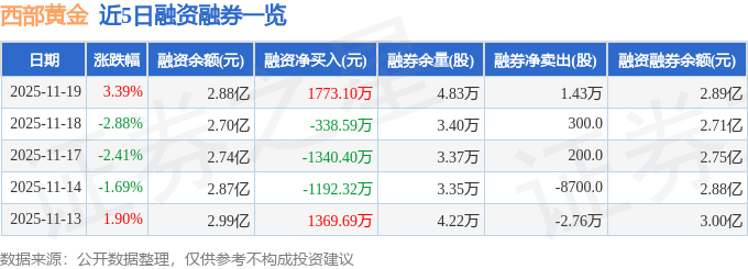 西部黄金融资融券信息显示,融资方面,当日融资买入4417.83万元,融资偿还2644.73万元,融资净买入1773.1万元。融券方面,融券卖出1.66万股,融券偿还2300.0股,融券余量4.83万股,融券余额129.69万元。融资融券余额2.89亿元。