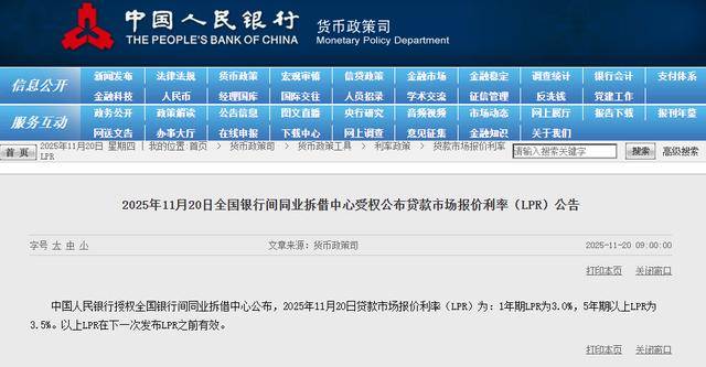 11月20日,中国人民银行授权全国银行间同业拆借中心公布,2025年11月20日贷款市场报价利率(LPR)为:1年期LPR为3.0%,5年期以上LPR为3.5%,为连续六个月保持不变。