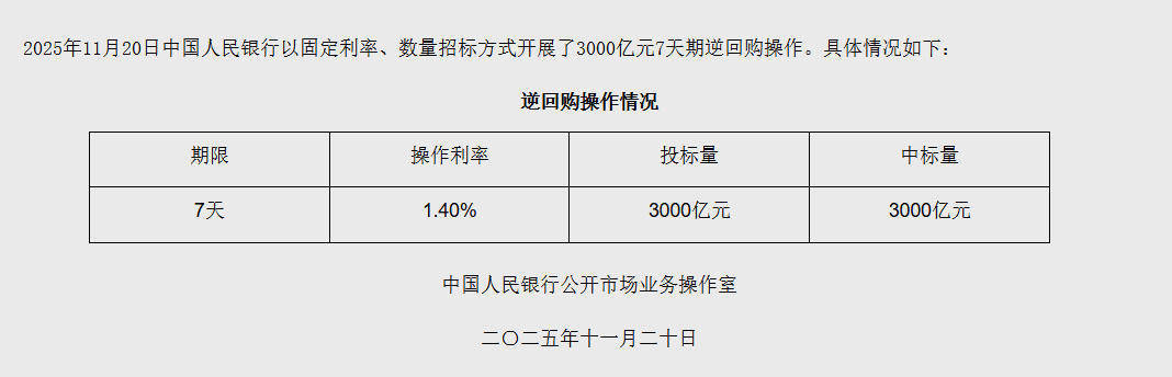 中新网11月20日电 据央行网站消息,2025年11月20日中国人民银行以固定利率、数量招标方式开展了3000亿元7天期逆回购操作。具体情况如下: