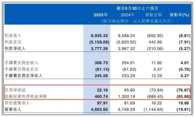2025年上半年,江西银行利息净收入下降幅度进一步扩大,同比减少5.27%;同时,投资收益产生了大幅减少,交易净收益同比减少76.87%、金融投资所得收益净额同比减少65.88%。就投资收益下滑的原因,财报中,江西银行称主要是市场利率及资产价值波动共同影响所致。