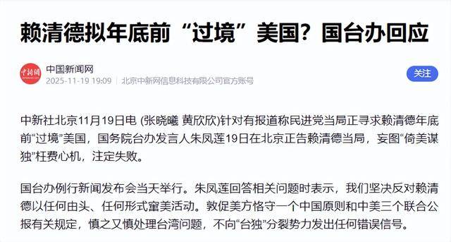 中国新闻网 2025-11-19 赖清德拟年底前“过境”美国?国台办回应