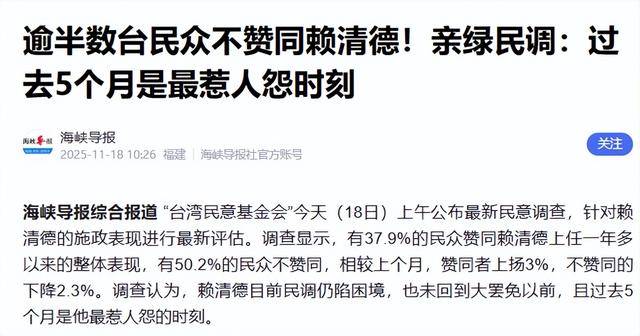 海峡导报 2025-11-18 逾半数台民众不赞同赖清德!亲绿民调:过去5个月是最惹人怨时刻