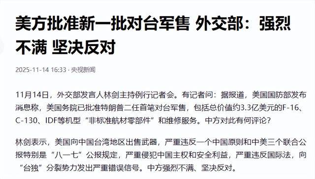 信源来自:央视新闻 2025-11-14 美方批准新一批对台军售 外交部:强烈不满 坚决反对