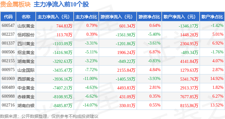 从资金流向上来看,当日贵金属板块主力资金净流出4.62亿元,游资资金净流入2696.89万元,散户资金净流入4.35亿元。贵金属板块个股资金流向见下表: