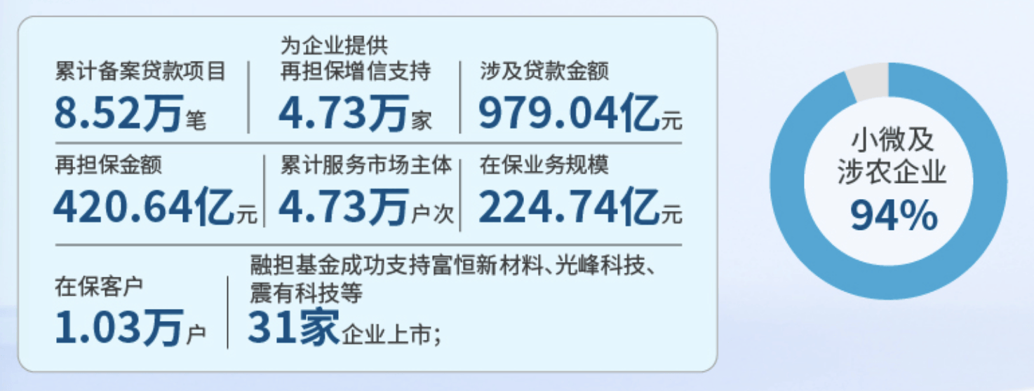 比如,支持中小企业融资。支小业务占比95.11%,单户500万元及以下业务占比61.67%,均大幅超过国办发6号文政策要求;再担保贷款项目平均贷款利率降至3.27%,较去年同期下降0.51个百分点,在国家融担基金35家合作机构中排名第五。