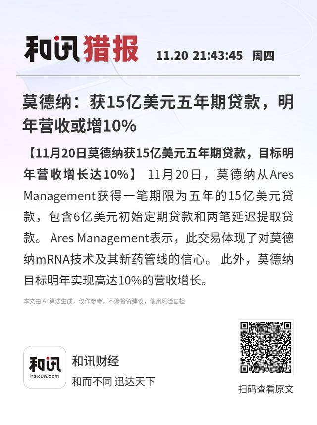 【11月20日莫德纳获15亿美元五年期贷款,目标明年营收增长达10%】11月20日,莫德纳从Ares Management获得一笔期限为五年的15亿美元贷款,包含6亿美元初始定期贷款和两笔延迟提取贷款。 Ares Management表示,此交易体现了对莫德纳mRNA技术及其新药管线的信心。 此外,莫德纳目标明年实现高达10%的营收增长。