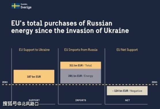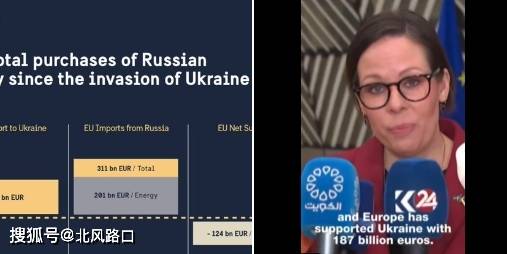 欧盟向乌克兰提供了1870亿欧元的援助,却从俄罗斯进口价值3110亿欧元的石油、天然气和其他商品,差额到达1240亿欧元。