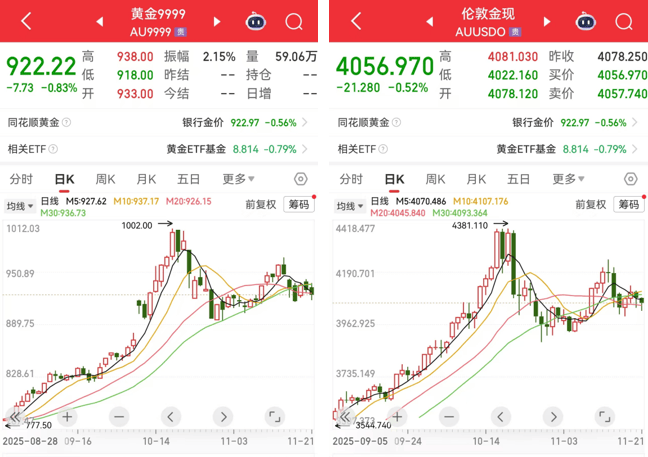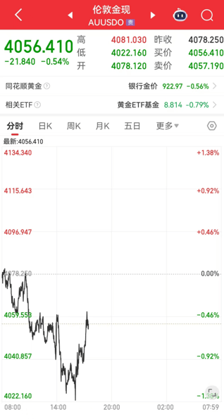 同花顺数据显示,截至北京时间11月21日17时30分,伦敦现货黄金价报4056.41美元/盎司,日跌幅约0.5%,呈“V”型走势;上海黄金交易所现货黄金(Au99.99)收盘价报922.22元/克,日跌幅约0.8%。