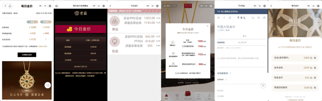 11月21日,周生生足金首饰境内价格为1295元/克,单克较前一日下跌12元;老庙黄金上海区域足金饰品价格为1298元/克,单克较前一日下跌4元;周大福足金(饰品、工艺品类)、谢瑞麟足金饰品、潮宏基足金(首饰摆件)境内价格为1305元/克,六福珠宝足金999/足金境内价格为1303元/克,单克均与前一日持平。