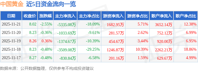证券之星消息,截至2025年11月21日收盘,中国黄金(600916)报收于8.02元,下跌2.55%,换手率2.17%,成交量36.45万手,成交额2.95亿元。