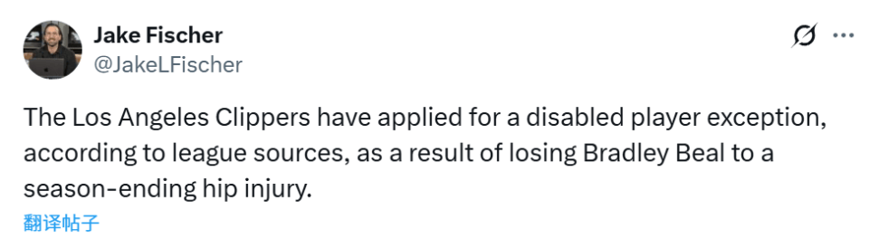 北京时间11月22日,据名记杰克-费舍尔报道,鉴于布拉德利-比尔因髋部伤势赛季报销,洛杉矶快船队已经申请伤病特例。