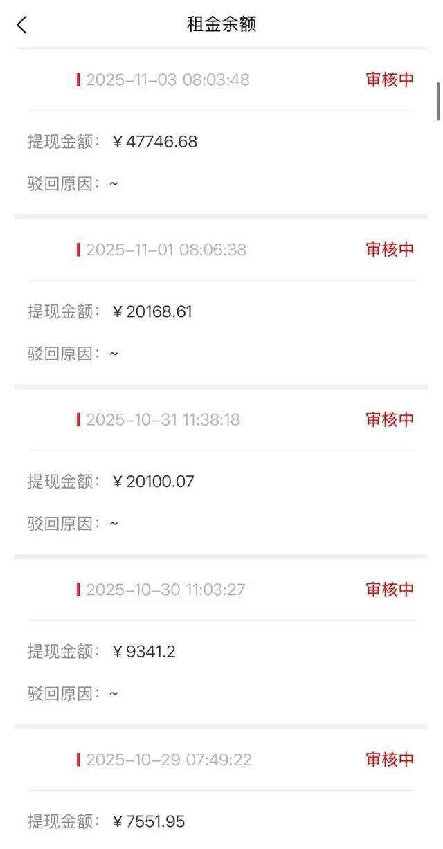 平台早在今年9月底就出现了异常。不少人发现提现页面长期停留在“审核中”,但大家没有太紧张,有投资者回忆,2025年春节期间,青云租也曾出现过二十多天的提现延迟,之后业务恢复正常。他们以为,这次延迟可能和国庆假期有关。