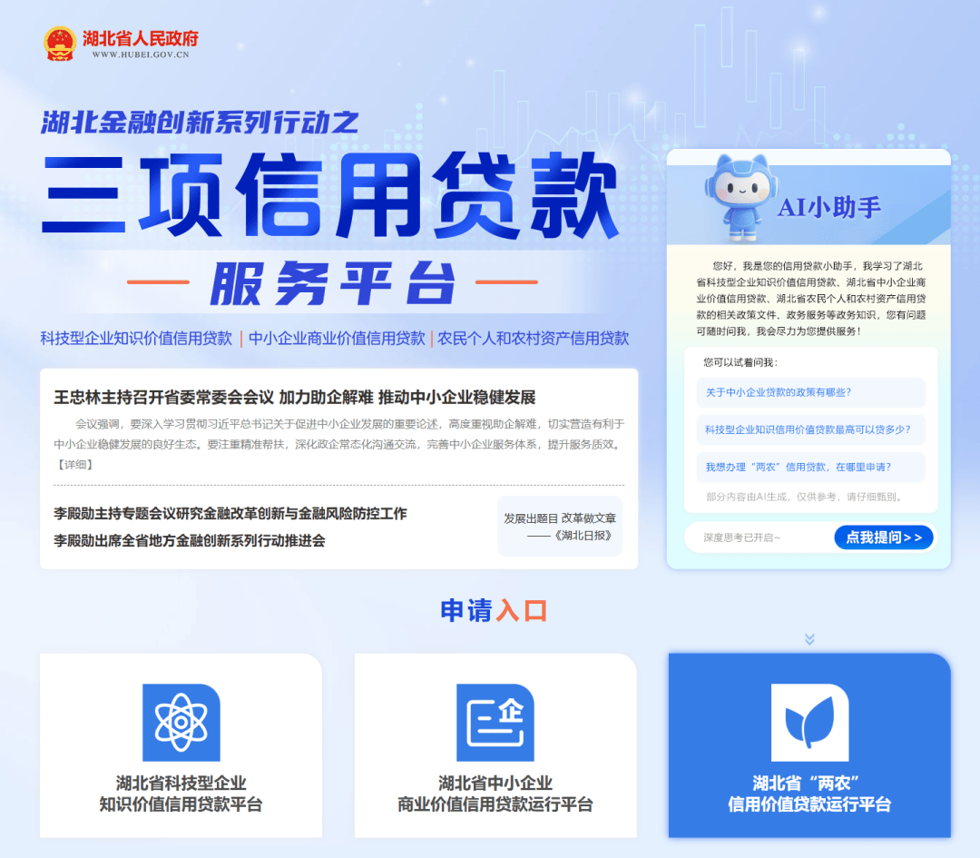 “湖北金融创新系列行动之三项信用贷款服务平台”集合了湖北省科技型企业知识价值信用贷款平台、湖北省中小企业商业价值信用贷款运行平台、湖北省“两农”信用价值贷款运行平台三项信用贷款申请入口,聚焦科技企业、中小微企业及农民群体融资难题,为企业和农民提供一份“信用贷款”全景地图,一站式解决“能否办、怎么办、在哪办”等问题,推动金融活水流到研发工厂、生产车间、田间地头,让真金白银更快、更准、更有效地惠企利民。