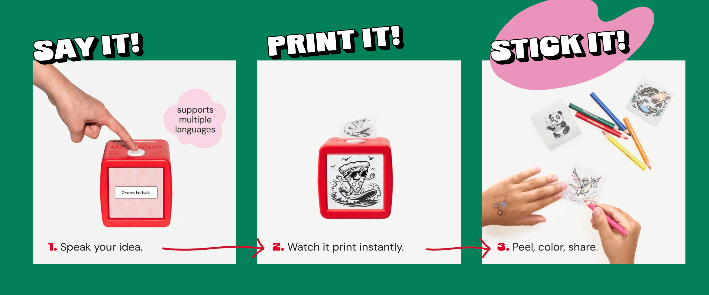 与被动的屏幕工具不同,Stickerbox鼓励孩子们进行开放式的真实世界游戏。孩子们只需说出他们的想法,从“踩着滑板的恐龙”到“航行在外太空的维京船”,就能看到他们的想象力瞬间变成一张高质量的黑白贴纸。