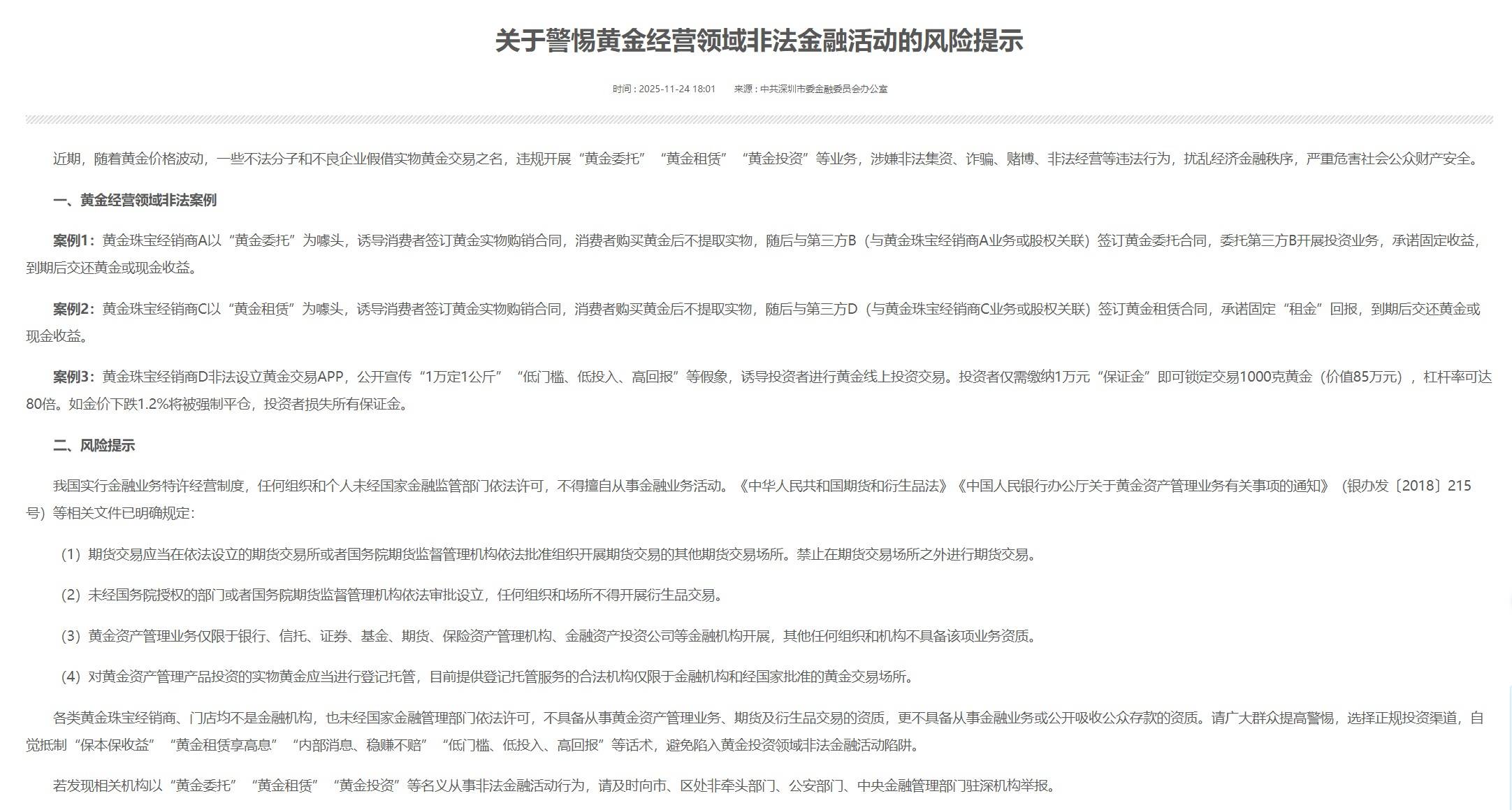 11月24日,深圳市防范和打击非法金融活动专责小组办公室发布《关于警惕黄金经营领域非法金融活动的风险提示》指出,各类黄金珠宝经销商、门店均不是金融机构,也未经国家金融管理部门依法许可,不具备从事黄金资产管理业务、期货及衍生品交易的资质,更不具备从事金融业务或公开吸收公众存款的资质。请广大群众提高警惕,选择正规投资渠道,自觉抵制“保本保收益”“黄金租赁享高息”“内部消息、稳赚不赔”“低门槛、低投入、高回报”等话术,避免陷入黄金投资领域非法金融活动陷阱。
