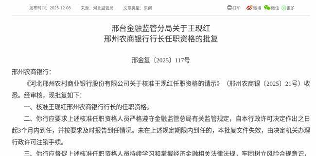 2025年12月08日,根据国家金融监督管理总局消息,《河北邢州农村商业银行股份有限公司关于核准王现红任职资格的请示》获得通过,批复王现红河北邢州农村商业银行股份有限公司行长的任职资格。