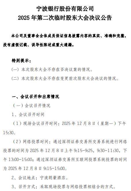 12月8日,宁波银行发布2025年第二次临时股东大会决议公告。会议以特别决议审议通过了《关于修订的议案》《关于不再设立监事会的议案》;以普通决议审议通过了《关于修订的议案》《关于修订的议案》《宁波银行股份有限公司2025年度中期利润分配方案》。