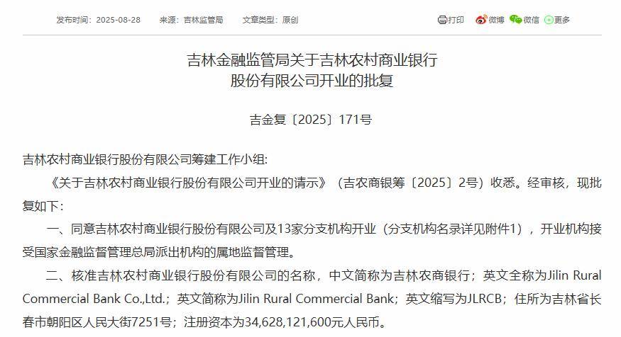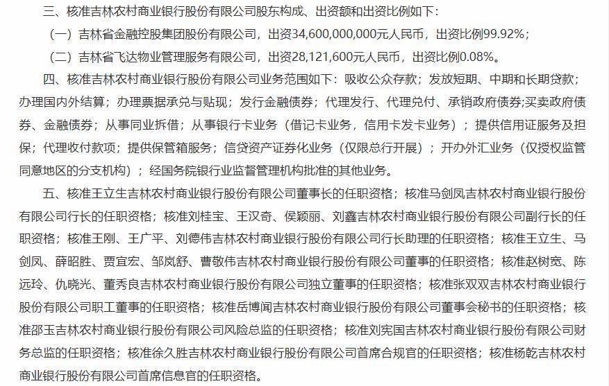 据吉林金融监管局,吉林农商银行于今年8月获批成立。批复显示,吉林农商银行的注册资本为346.28亿元,其中吉林省金融控股集团股份有限公司出资346亿元,出资比例99.92%;吉林省飞达物业管理服务有限公司出资2812.16万元,出资比例0.08%。彼时吉林农商银行经营范围为:吸收公众存款;发放短期、中期和长期贷款;办理国内外结算;办理票据承兑与贴现;发行金融债券;代理发行、代理兑付、承销政府债券;买卖政府债券、金融债券;从事同业拆借;从事银行卡业务(借记卡业务,信用卡发卡业务);提供信用证服务及担保;代理收付款项;提供保管箱服务;信贷资产证券化业务(仅限总行开展);开办外汇业务(仅授权监管同意地区的分支机构);经国务院银行业监督管理机构批准的其他业务。