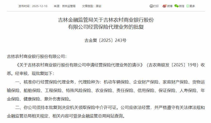 12月10日,国家金融监督管理总局吉林监管局发布批复,核准吉林农商银行经营保险代理业务,代理险种为:机动车辆保险、企业财产保险、家庭财产保险、货物运输保险、船舶保险、工程保险、特殊风险保险、农业保险、责任保险、信用保险、保证保险、人寿保险、年金保险、健康保险、意外伤害保险。