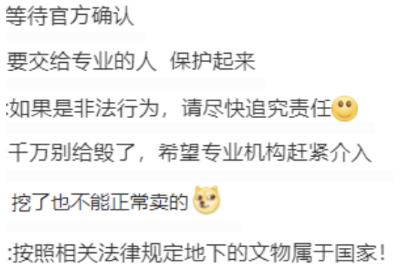事件一经发酵,迅速点燃公众热情,在许多社交平台上,网友的讨论地如火如荼。纷纷呼吁官方与专业机构介入,让专业人员对现场和物品进行保护、调查,避免文物遭到破坏。