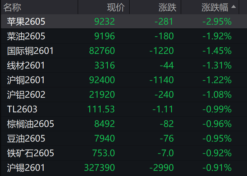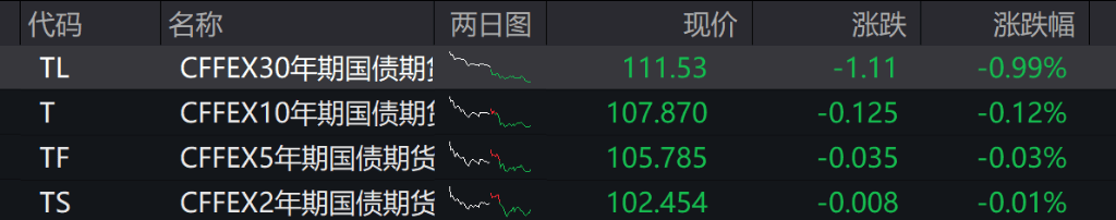 国债期货全线下跌,30年期主力合约跌0.99%,10年期主力合约跌0.12%,5年期主力合约跌0.03%,2年期主力合约跌0.01%。