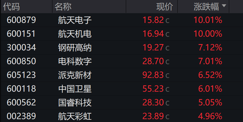 华菱线缆、中超控股双双3连板。航天电子、航天机电涨停。