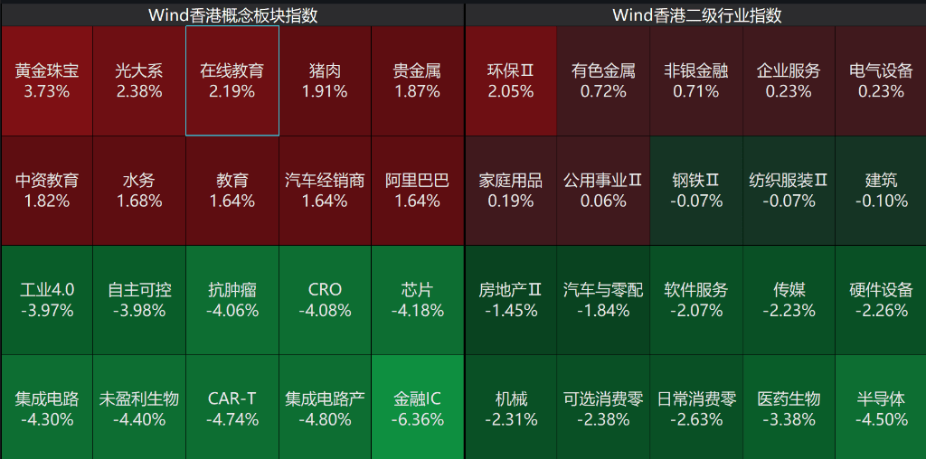 板块方面,防御与公用事业板块表现稳健,黄金珠宝、猪肉、水务等板块上涨;下跌方面,半导体与生物科技板块全线暴跌,金融IC、芯片、集成电路、CAR-T等硬科技与创新药概念深度调整。
