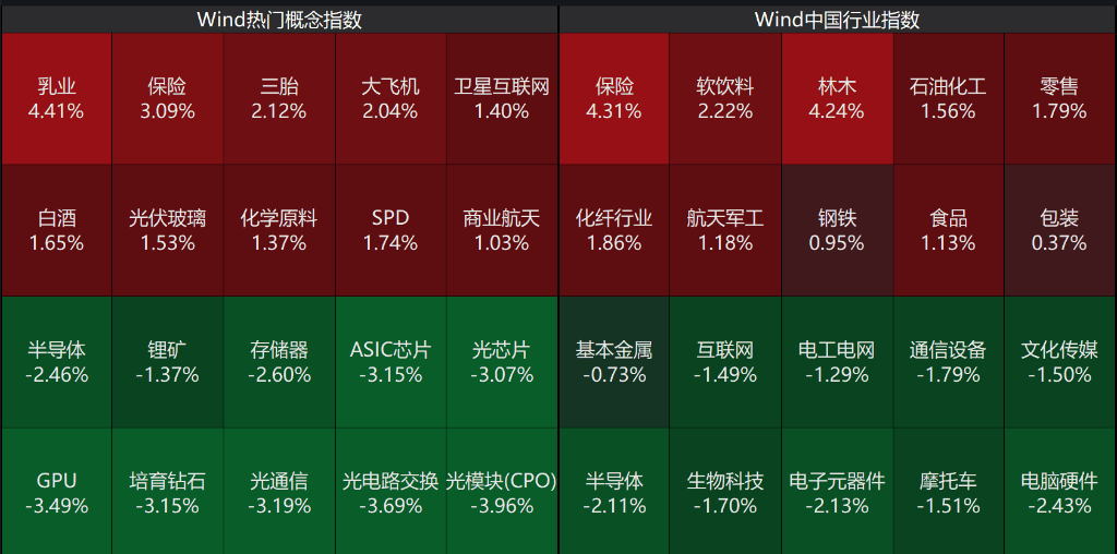 盘面上,个股跌多涨少,今日成交1.79万亿。板块方面,大消费与避险板块领涨,乳业、保险、白酒等集体走强,大飞机、商业航天等高端制造题材活跃;下跌方面,半导体与光通信产业链全线重挫,GPU、光模块(CPO)、光芯片、ASIC芯片等领跌市场。