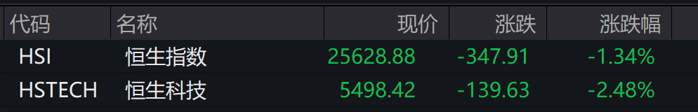 港股:截至收盘:恒生指数收跌1.34%,恒生科技指数收跌2.48%