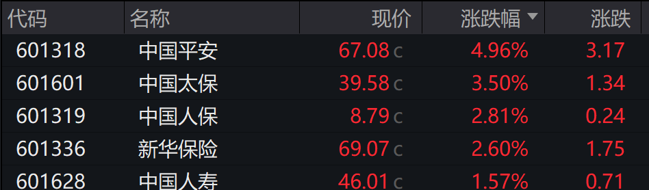 中国平安涨幅近5%,中国太保涨3.5%,中国人保涨2.81%。