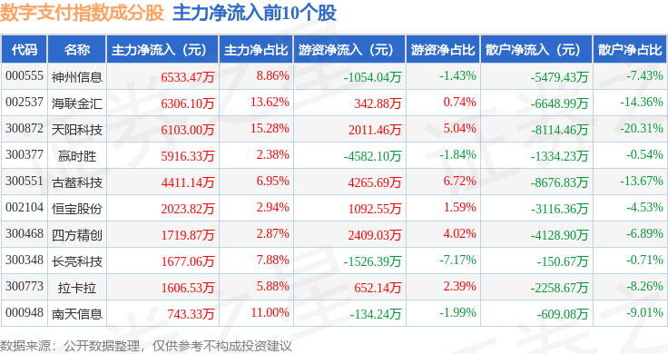 资金流向方面,数字支付(980113)指数成份股当日主力资金净流出合计7.37亿元,游资资金净流入合计2.54亿元,散户资金净流入合计4.63亿元。成份股资金流向详情见下表: