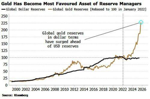 随着金价回升,黄金估值随之攀升。结果是,黄金储备的美元价值大幅超越了其他以美元计价的储备资产(如美债)。