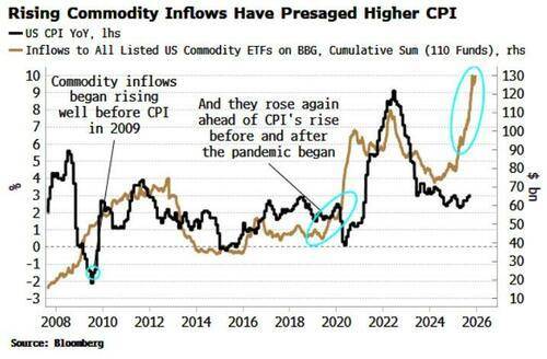 更多大宗商品正突破疫情后三年的价格区间,包括铝、锡、铜、咖啡、活牛和天然气。此外,今年流入大宗商品ETF的资金迅速增长——此前两次出现这种情况是在2009年和2021年,都预示着通胀将大幅上升。